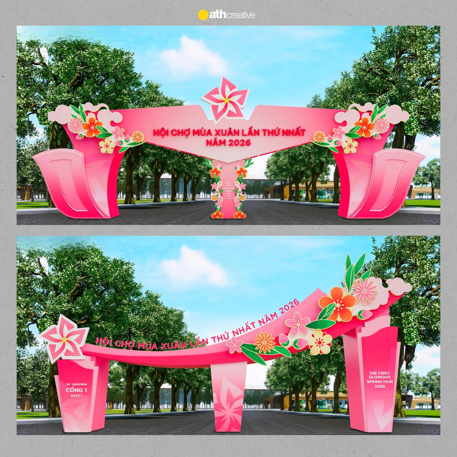 Tổng thể thiết kế hướng tới việc tạo nên một không gian hội chợ mang tính kết nối, nơi các yếu tố văn hóa mùa xuân được kể lại bằng ngôn ngữ thiết kế đương đại. Hệ cổng không chỉ đóng vai trò trang trí mà còn là biểu tượng của sự khởi đầu, chào đón và lan tỏa năng lượng tích cực. Việc tổ chức không gian mạch lạc, đồng bộ giúp tối ưu trải nghiệm người tham gia, đảm bảo hiệu quả thi công, nhận diện và vận hành, đồng thời khẳng định tư duy thiết kế bền vững và nhất quán của ATH Creative trong các dự án quy mô lớn.