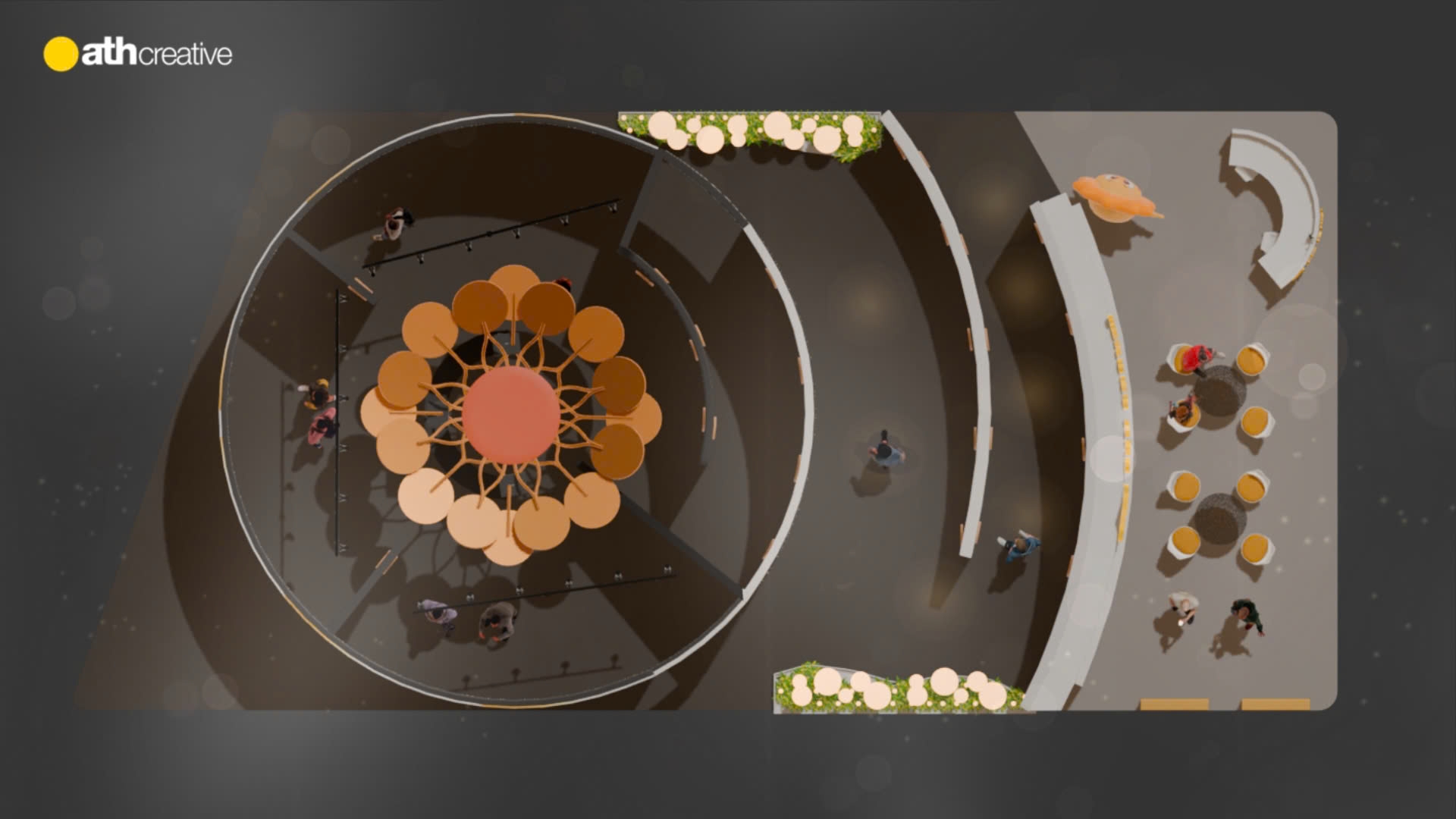 Không gian được định hình với cấu trúc thoáng, tối ưu khả năng tiếp cận từ nhiều hướng, đồng thời tổ chức các điểm nhấn theo trục trung tâm nhằm tạo sự tập trung thị giác. Các khu chức năng được bố trí xoay quanh, đảm bảo hành trình trải nghiệm liền mạch: từ thu hút - khám phá - tương tác - ghi nhớ.